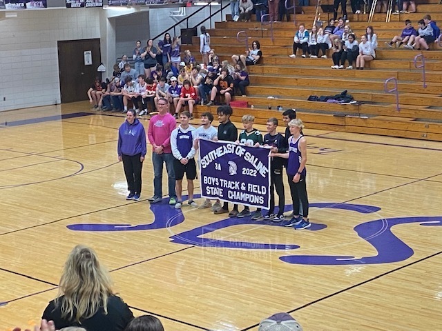 Coach Caselman stood alone at center court to be honored for Kansas Cross Country coach of the year after his teams were honored for their state championships. Monday night basketball game gave us the opportunity to unveil the state banners that will hang from the rafters in the gym. Last spring's boys' track team won their second consecutive championship. This fall the girls' cross country squad completed a three-peat. Not only did these team win the state championship but dominated the field in both cases. The teams received a standing ovation from the crowd, as did their coach.